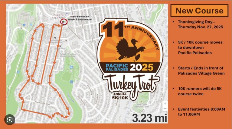 “Each year the Palisades Turkey Trot grows bigger and better, and this year’s new 5K course makes it extra special,” said David O’Connell, event co-founder. “It’s the perfect way for families and friends to start their Thanksgiving morning with fun, fitness, and community spirit.”