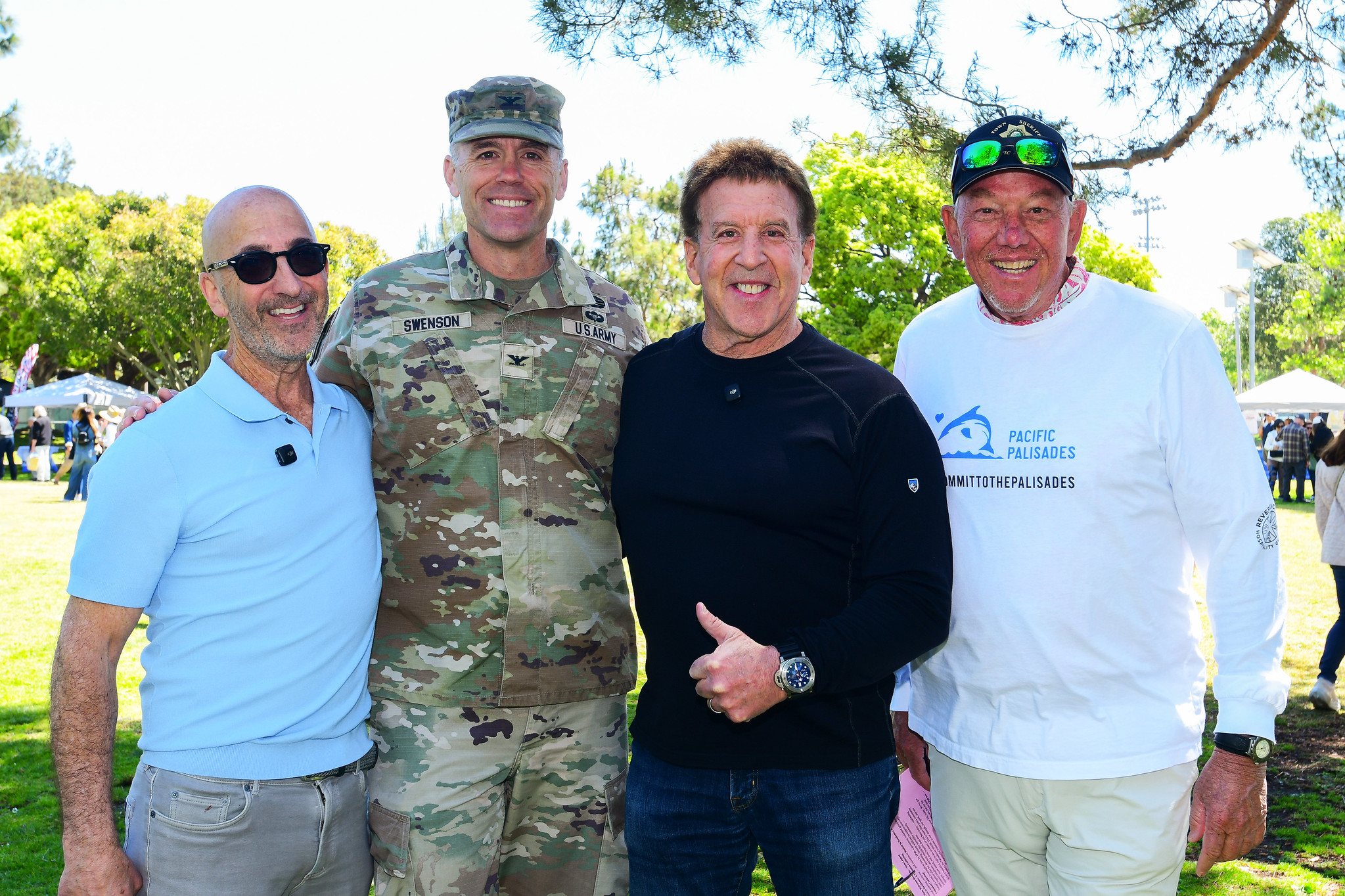 (Left to right) Anthony Marquleas welcomed Colonel Eric Swenson, Jake Steinfeld and Sam Lagana to the gathering of Palisades residents.