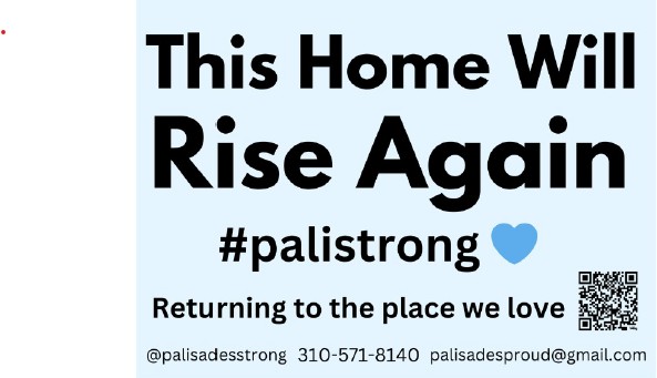 This signs are free, and Kamdar promises “We will place it for you.” (310) 571-8140 or Instagram is @palisadesstrong and to receive a form, the link is https://docs.google.com/forms/d/e/1FAIpQLScQi-voscvXz5KGS95KFx9pdDb0uII9TPYUdGWlINtCqjW3cQ/viewform?usp=dialog