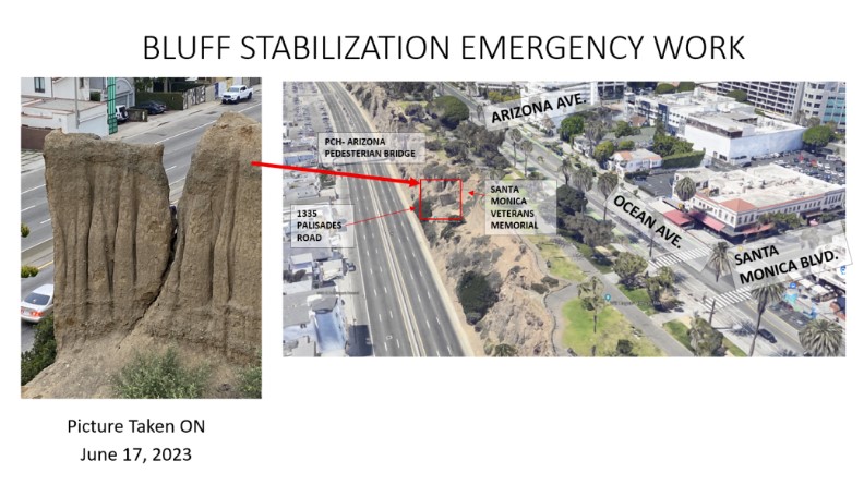 Santa Monica announced that a portion of the Santa Monica Bluffs, above Pacific Coast Highway, is unstable and needs emergency repairs.