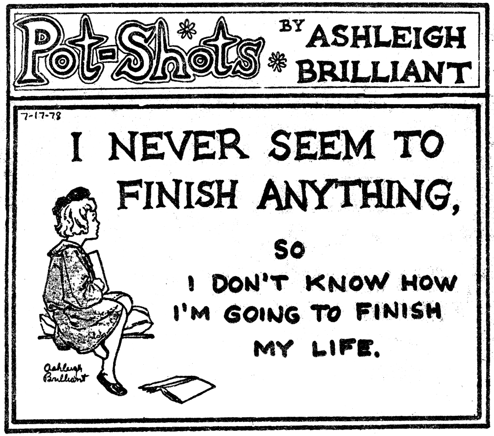 (Editor’s note: A reader, who is a fan of Ashleigh Brilliant (creator of Pot-Shots), has worked out an agreement with CTN that gives this newsletter the permission to use copyrighted Pot-Shots. Potshots remain the property of Ashleigh Brilliant. To view more about Brilliant, an author and cartoonist, go to https://www.ashleighbrilliant.com/)