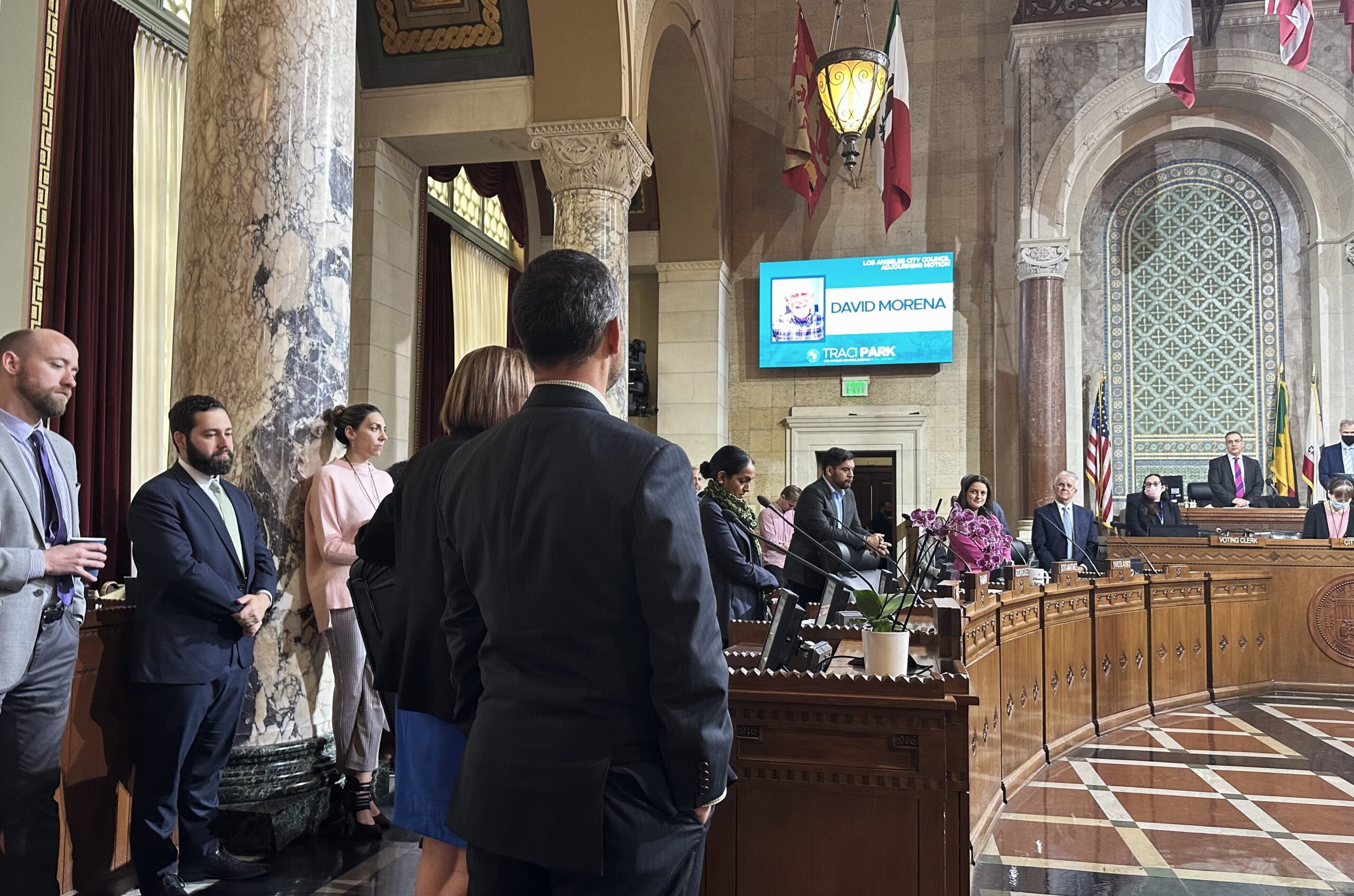 Councilmember Traci Park had a photo and the following information posted on a screen in City Hall, as it was read to the Councilmembers, staff and the public: