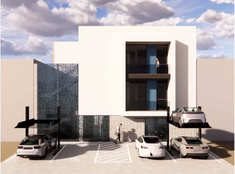 The back of the building would have to two car lifts. There would be no space for commercial parking, and no loading or unloading zone for the two commercial spaces.