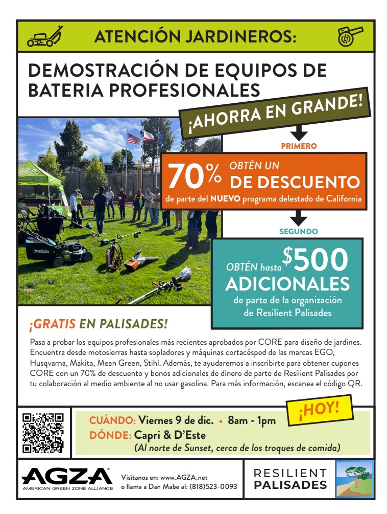 Resilient Palisades Clean Air and Water Team’s approach is to provide support from AGZA’s landscape zero emissions experts to determine how many batteries the gardeners need to run their business profitably.