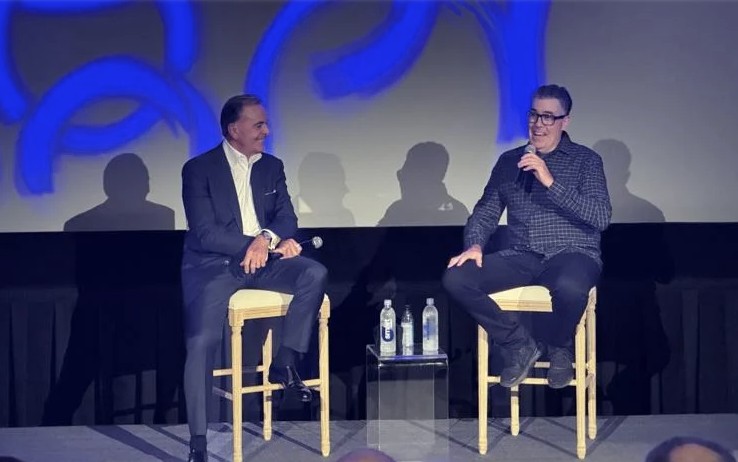 Rick Caruso (left) and Adam Corolla chat on stage in Glendale.
