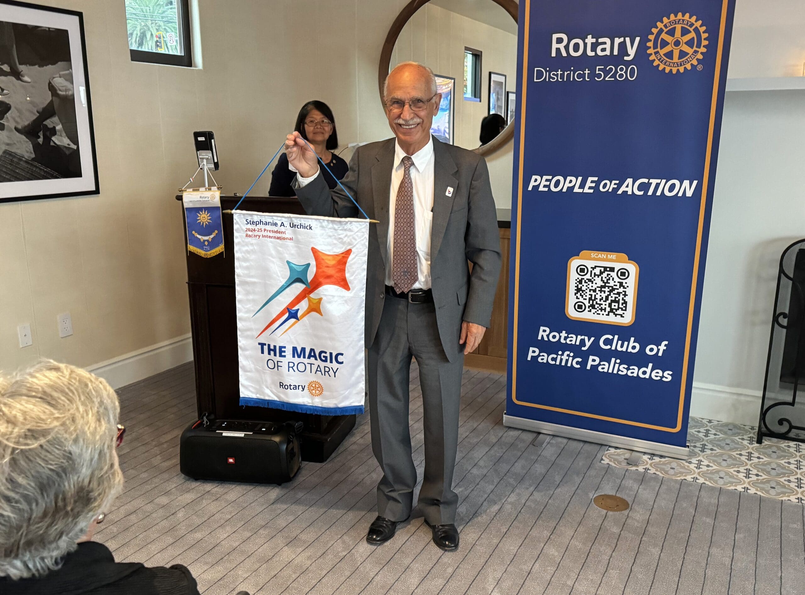 Hagop Tchakerian, the incoming president, holds the 2023-2025 Rotary theme banner.