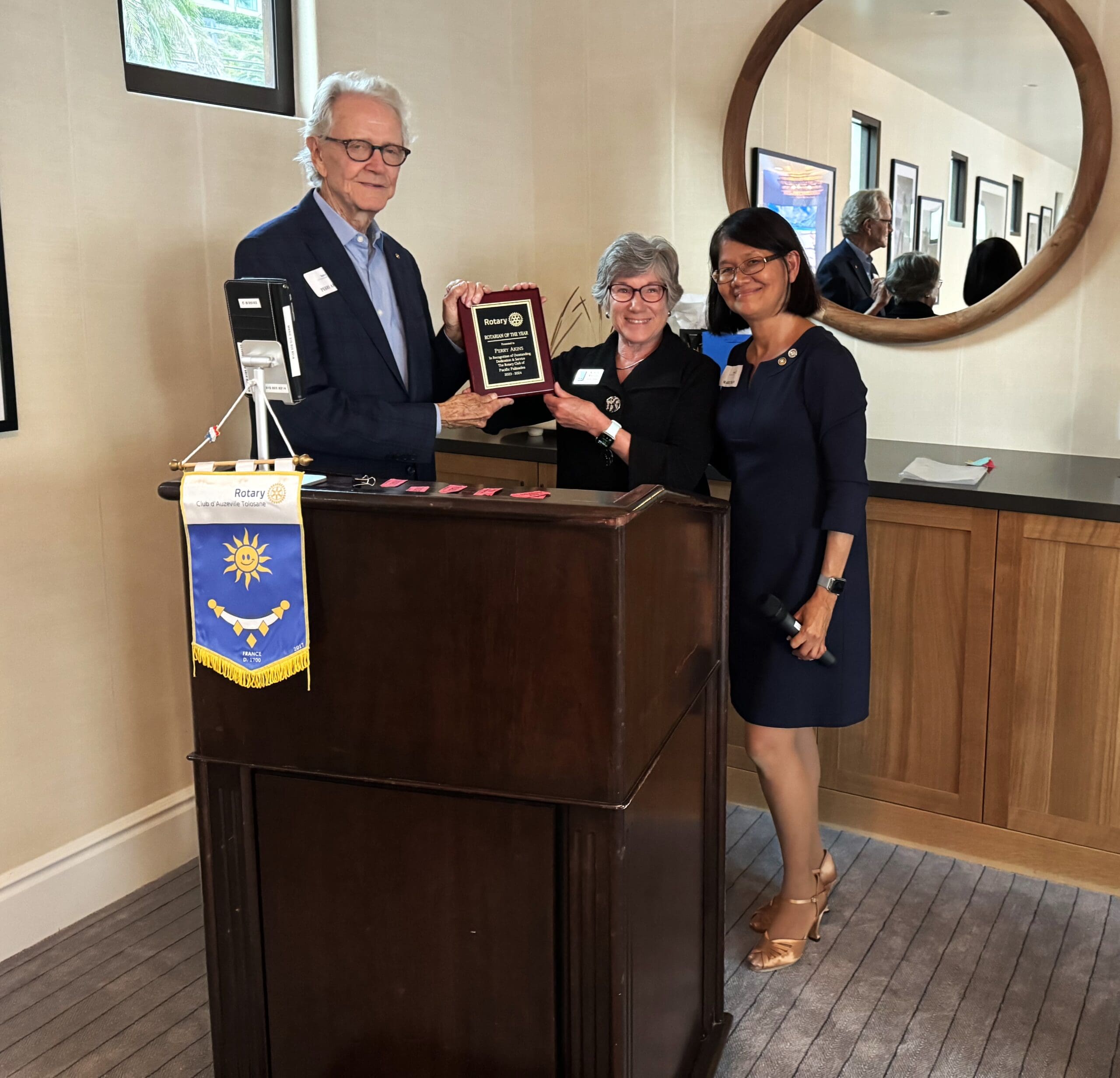 Perry Akins accepts the Rotarian of the Year Award from District Assistant Governor Karen Weigel, as past president Marie Tran (right) watches.
