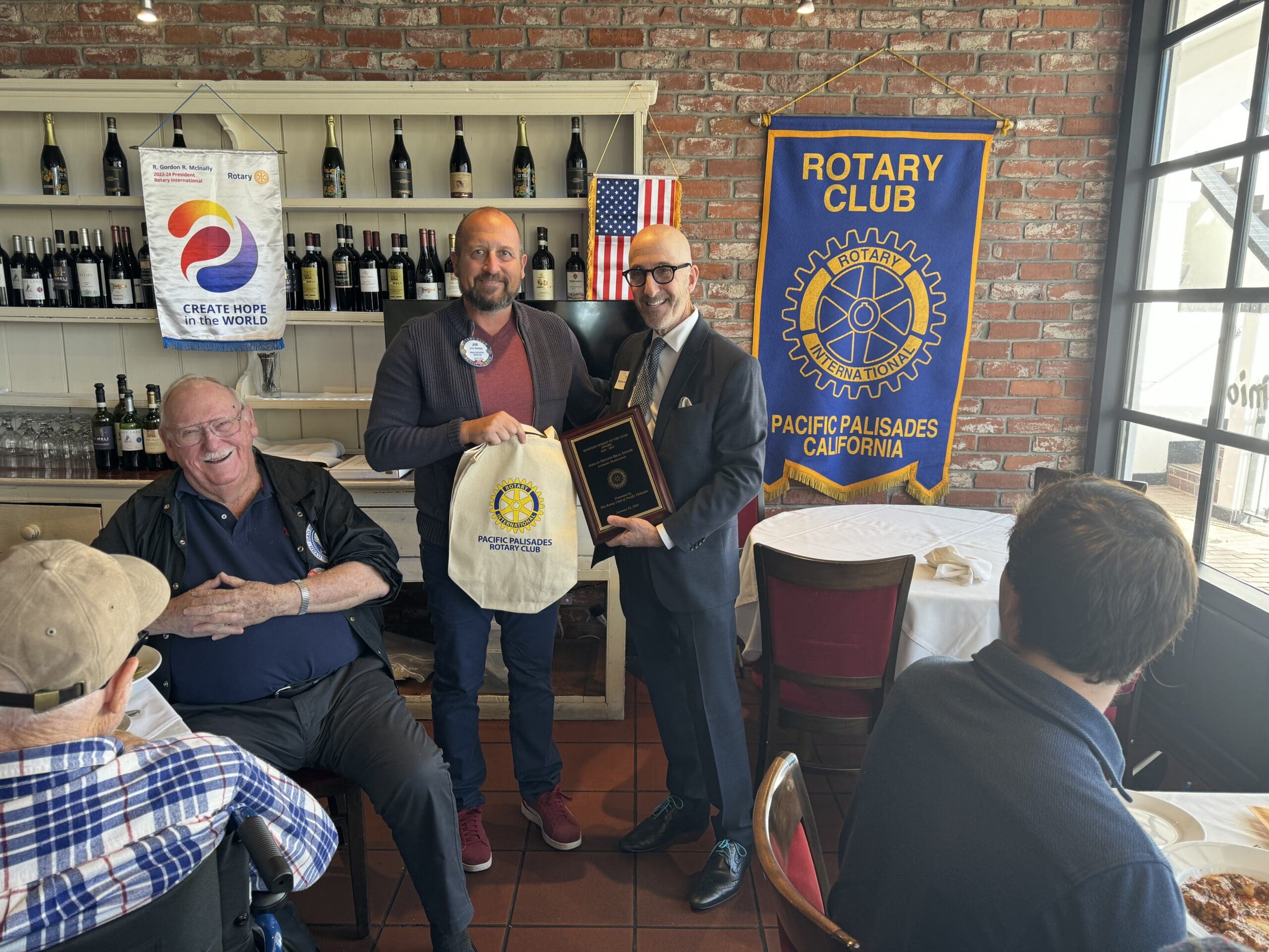The Palisades Rotary Club named Amalfi founder Anthony Marguleas as businessperson of the year. YMCA Executive Director Jim Kirtley (left) presents the award.