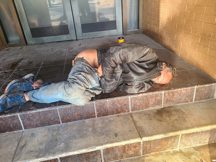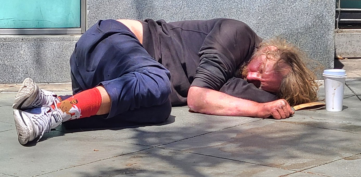 There appears to be no health care for the man lying on the sidewalk next to a center.