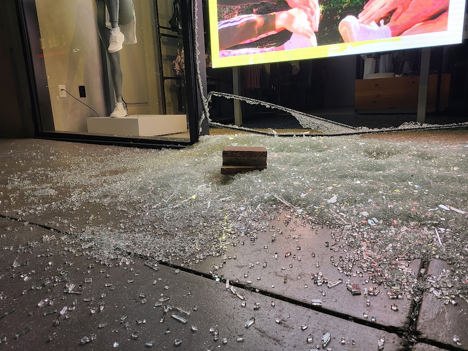 On Friday, there were four guards at the Promenade’s Apple Store. According to one source, the Adidas store on the Promenade has had its window smashed in April and November. The Footlocker has had its windows smashed four times in the last 16 months.