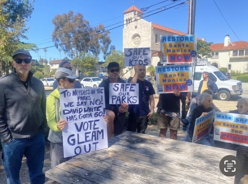 Residents of Santa Monica rallied at Reed Park Tuesday morning to protest a controversial needle distribution program, arguing that it has worsened problems by attracting more drug users to city parks, areas which have subsequently seen rises in crime and deadly overdoses.