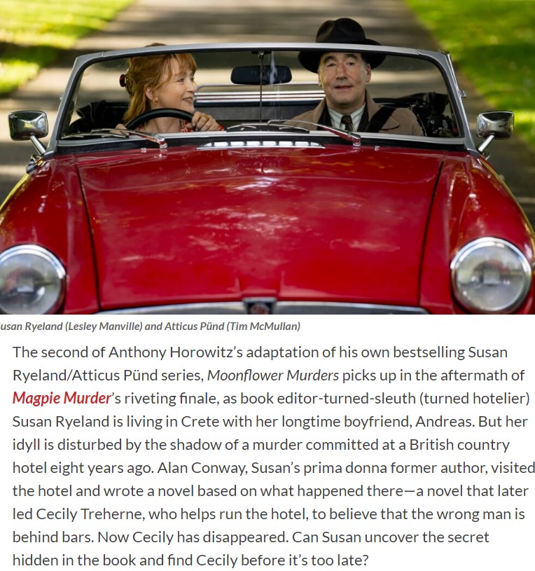Moonflower Murders is a deviously dark take on vintage English crime fiction. A book within a book. This book has some of the characters from Magpie Murders, both real and fictional (real in the book at least) – Susan Ryeland, the fictional Atticus Pund, and the hovering presence of Alan Conway the author, in a sense, of the murders both fictional and “real.”  An adaptation of the book (above) is showing on PBS starting on September 15.