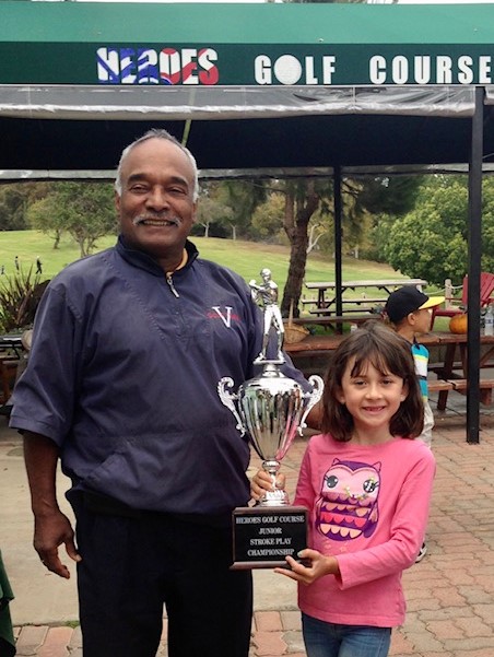This eight-year-old hit a hole in one on hole three. Her teacher Carlos Rodriquez congratulates her.