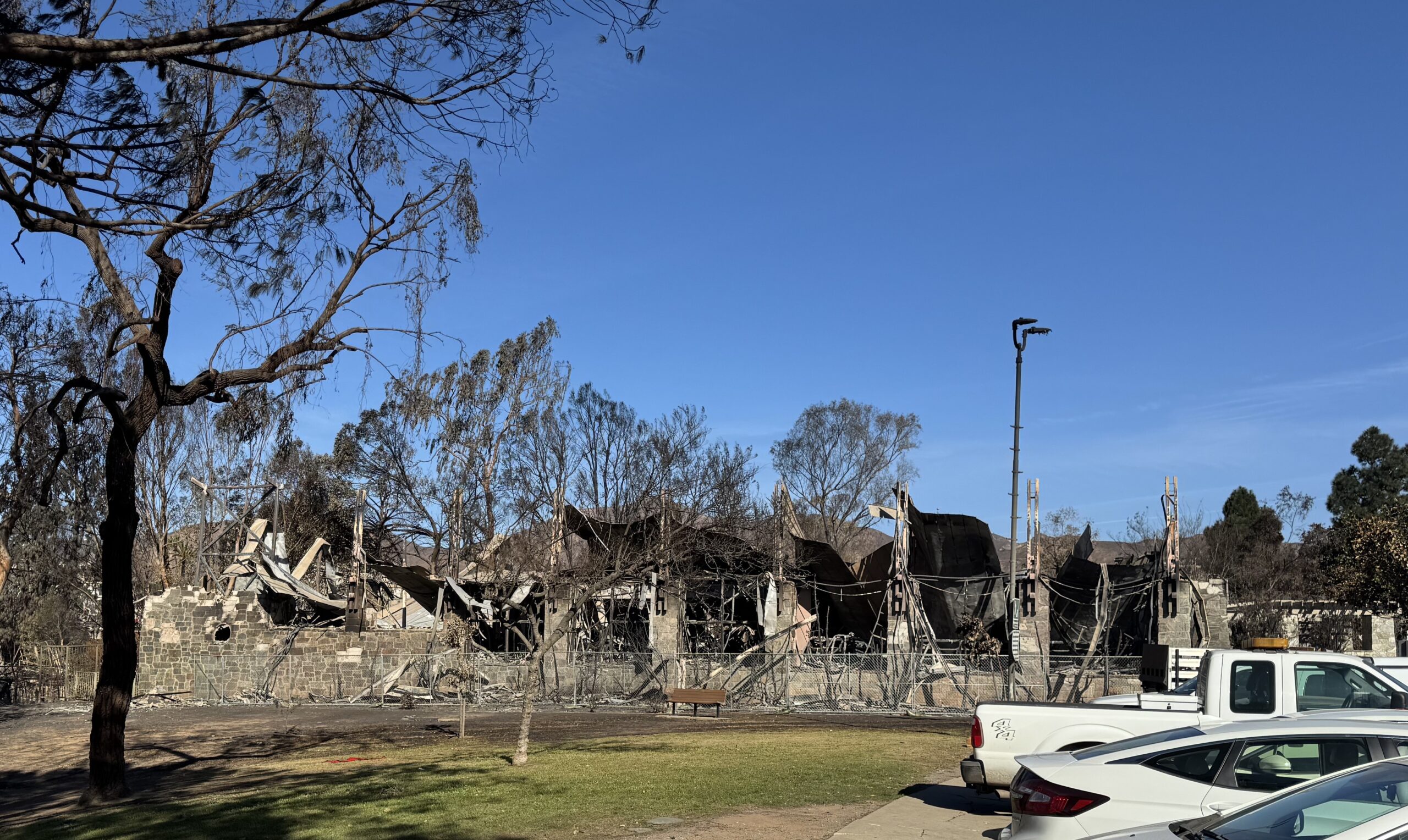This is the Palisades Library, after the fire, as seen from the park. This editor had two books on hold.