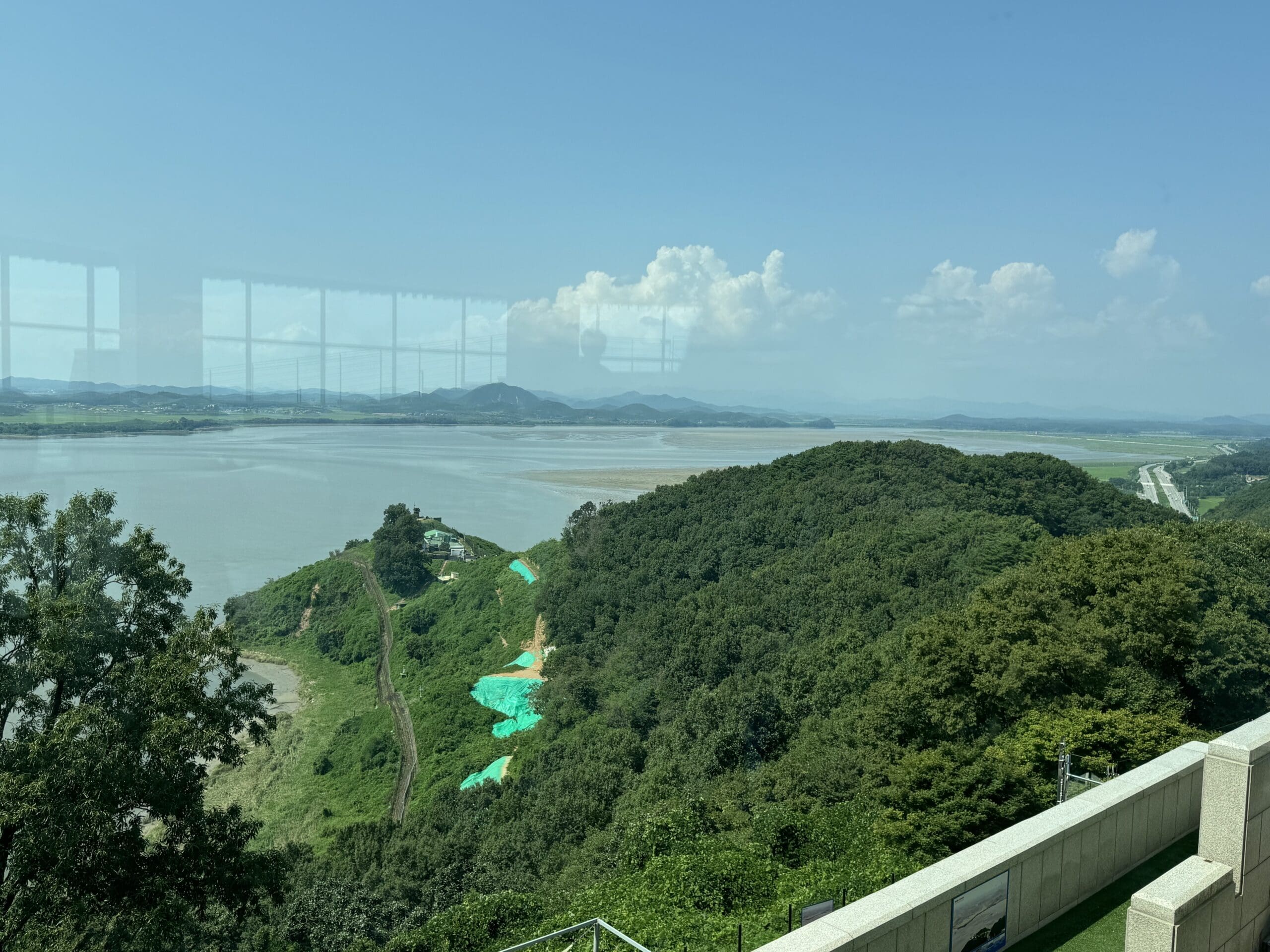 There is an observatory overlooks the confluence of the Han and Imjin Rivers. From the building, one can look across the river to North Korea. On the other side of the building one can look at South Korea.
