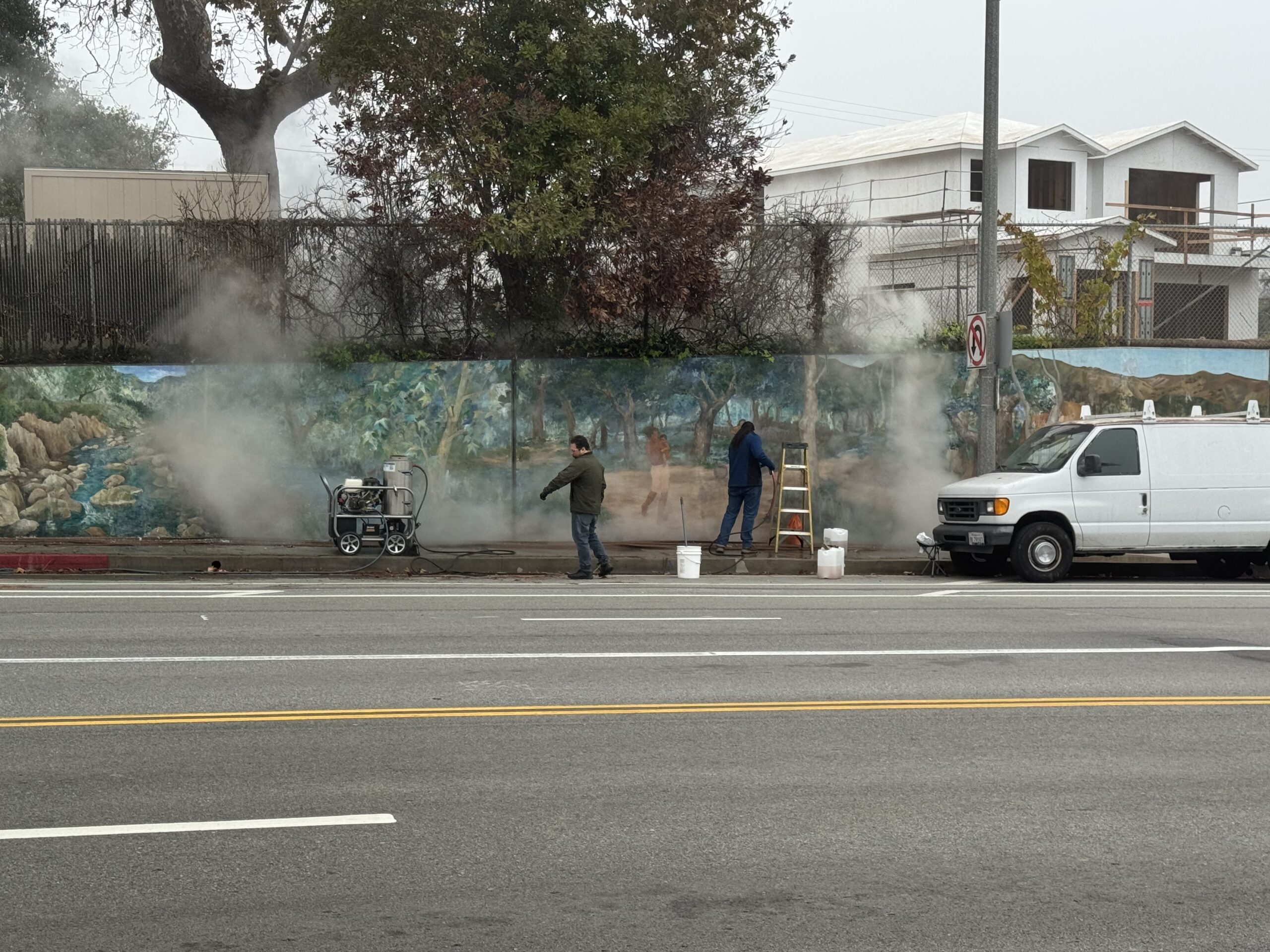 Workers were prepping the Temescal Canyon Mural, today.