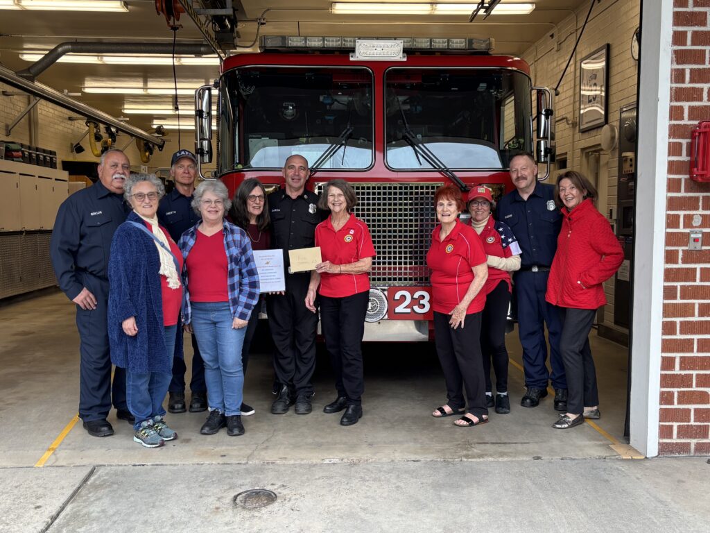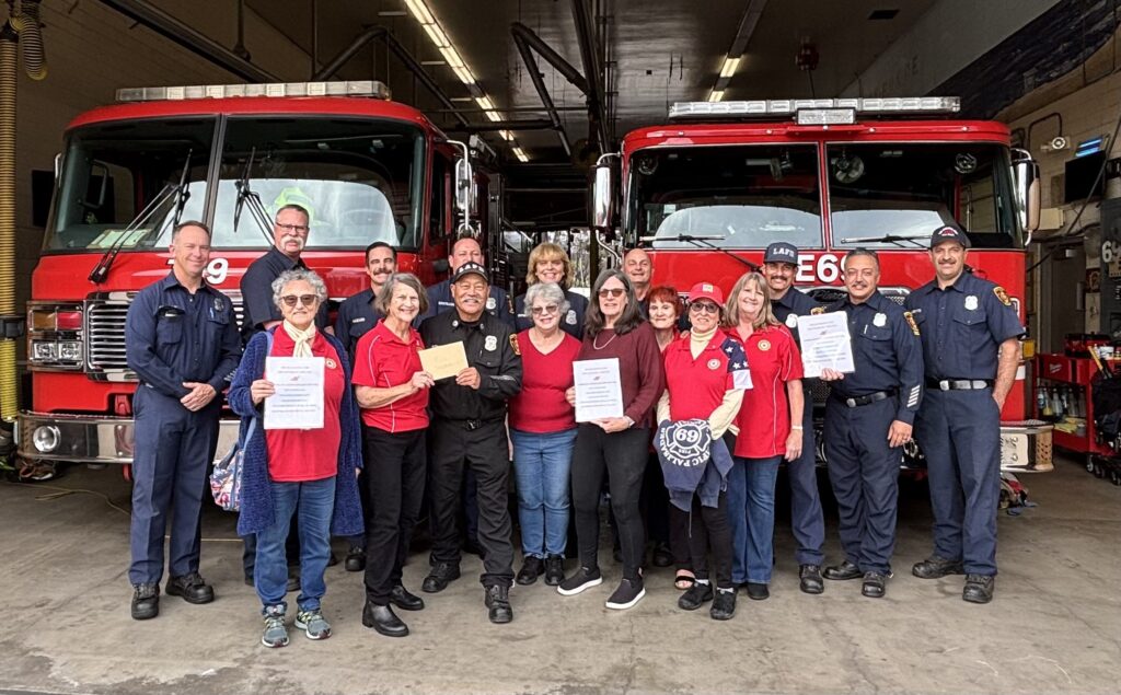 This year was no different. Auxiliary president Ruth Kahn said, “We will present gift cards for Palisades Garden Café to both fire stations (three $250 gift cards, one for each shift at Station 69 and one $500 gift card for Station 23).”