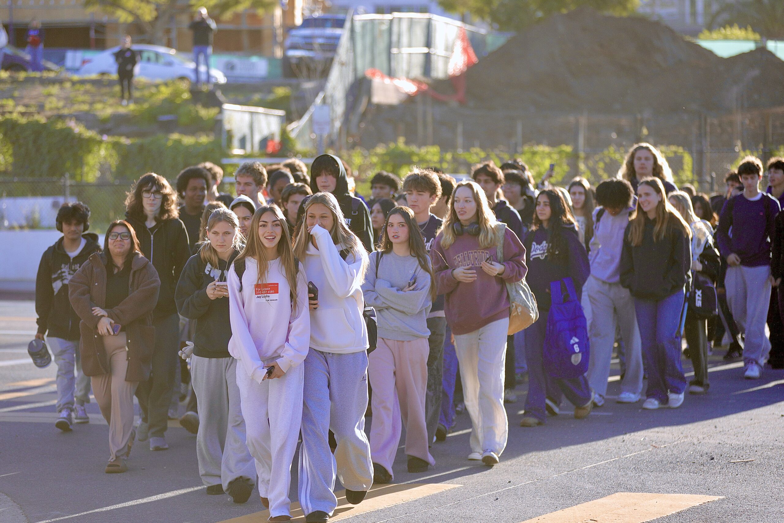 The Big Blue Bus stopped at the corner of Temescal, dropping off students, as did the Metro bus. Several yellow school buses also dropped students on the campus. Construction workers, parents and commuters on Temescal Canyon Road, honked their horns in support of students, before class started at 8:30 a.m.