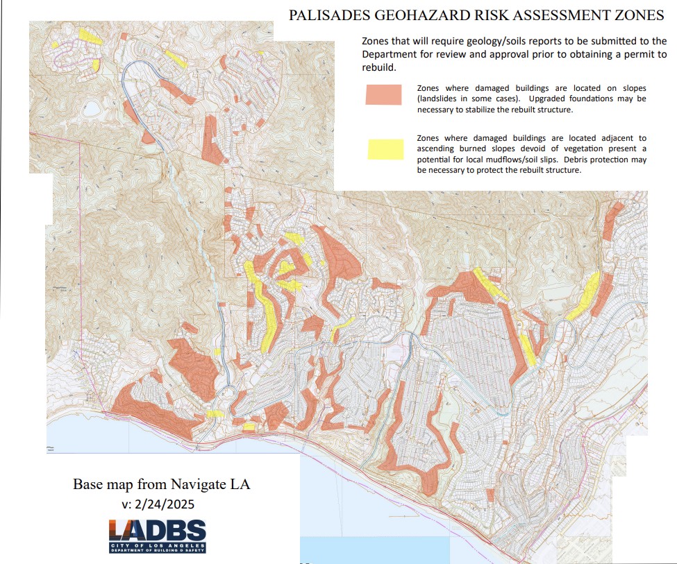 On April 17, the Department of Building and Safety released information about submitting Geotechnical and Soils Report. The bulletin identifies two separate geologically sensitive zones that are either on or next to steep slopes or potential landslide areas. Before rebuilding, those areas will require a Geotechnical and Soils Report to be submitted to the Grading Division for review click here.