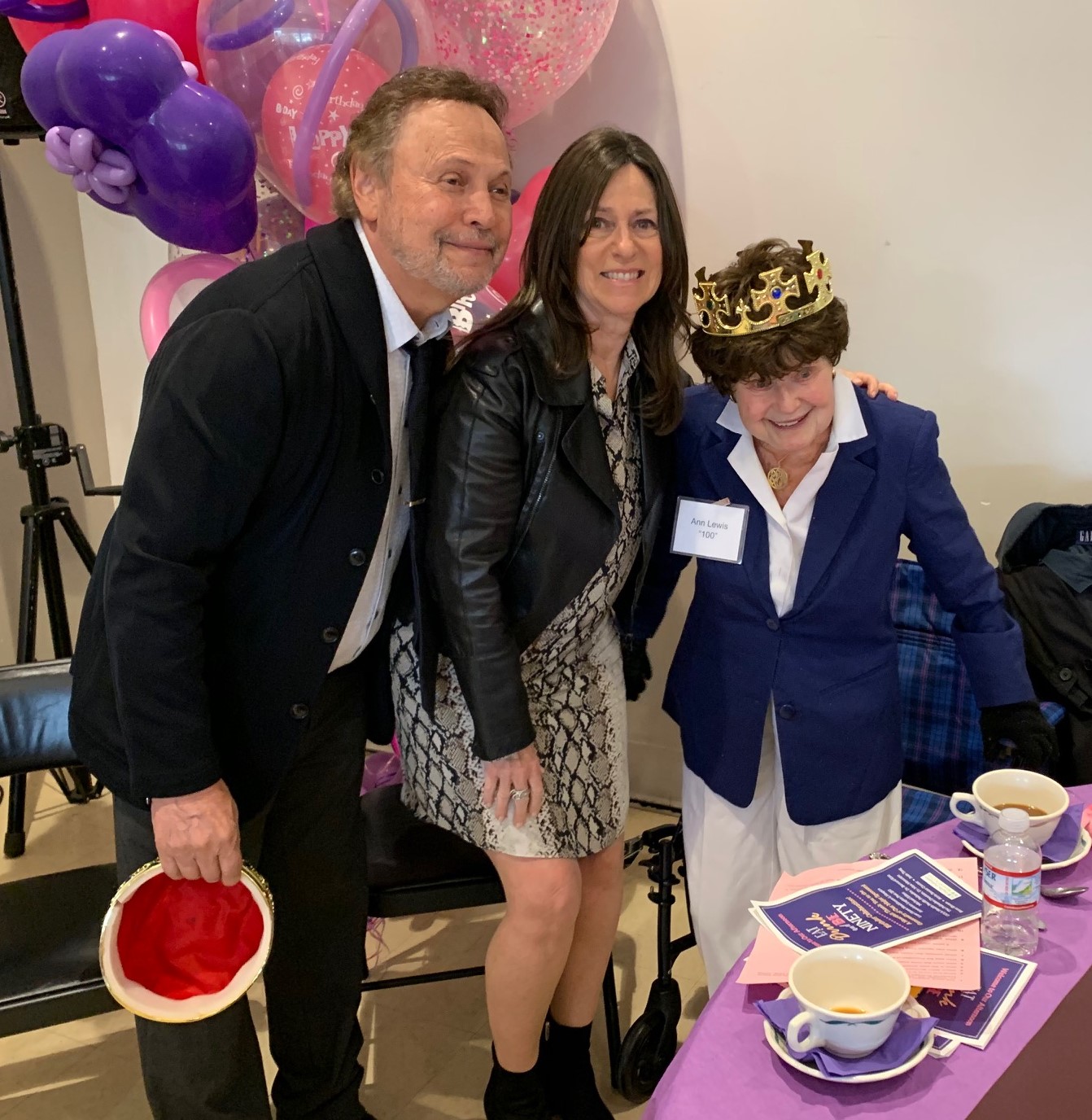 Pacific Palisades Co-Honorary Mayors Billy and Janice Crystal crowned Anne Lewis,100, as the oldest female attending the 90th Birthday Party.