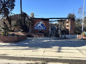 The neighborhood was devastated by the January 7 Palisades Fire, which also destroyed Marquez Elementary. The school’s mosaic survived but needs restoration.