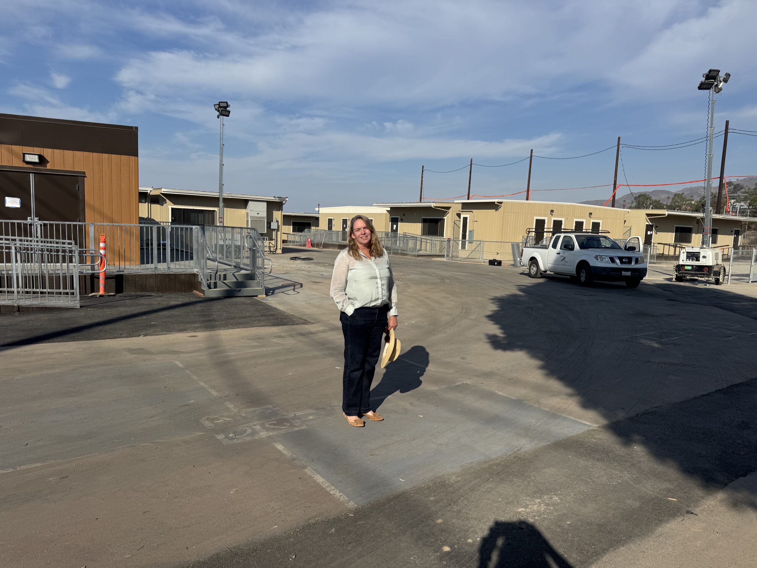 New Marquez Principal Lisa Timmerman stands in the area where students will attend school on the lower play yard.