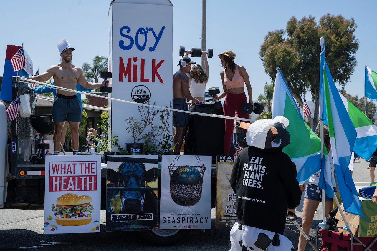“Around the base of the float, the team hung posters of movies that remind us eating less meat is good for our bodies and for the climate,” said RP co-founder Ryan Craig.