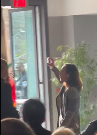 “Her speech was interrupted five times by individuals (one man and four women) seated throughout the crowd, standing, screaming and holding up their phones to record the reaction.