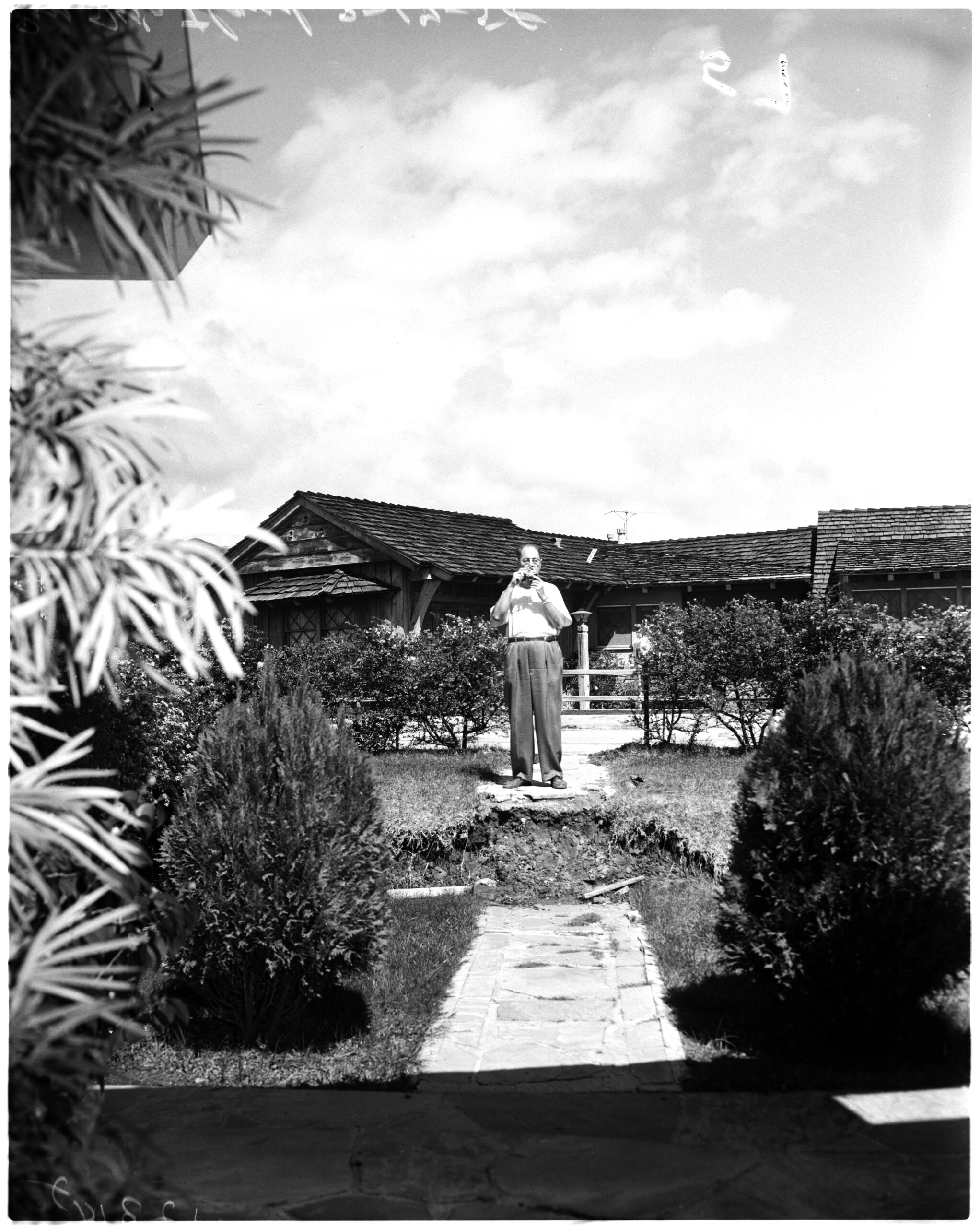 In 1958, a photo of the homes above the Tramonto slide, taken by the Los Angeles Examiner and housed at the University of Southern California, Roy M. Kirtland, a neighbor, prepares to shoot a picture of “unsafe: home at 17544 Tramonto Drive, Castellammare, (Pacific Palisades). He stands on a sidewalk, part of which has slipped three feet down the hillside. (Interestingly 17544 is one of three addresses with 17538 and 17550 that the developer plans to build.)