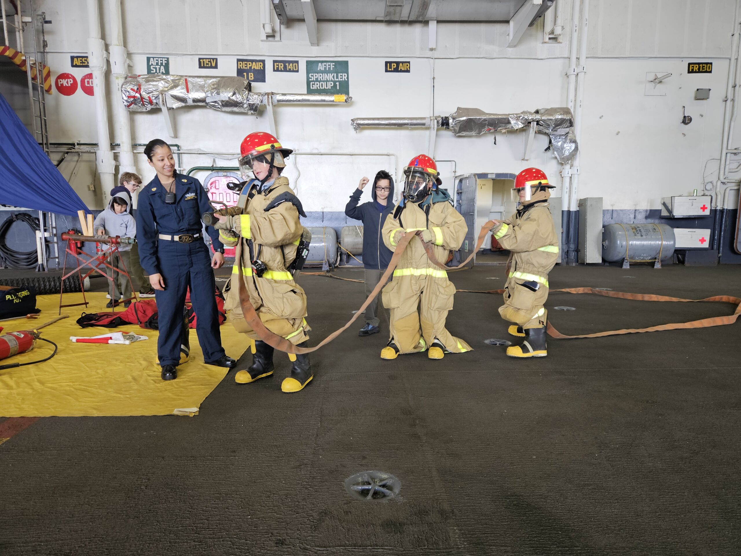 The Abraham Lincoln “Fire Crew” (left to right) is Chief Petty Officer Mayra Ochoa, Russell McCannel, Kami Naraghi and Ellis Sarn.