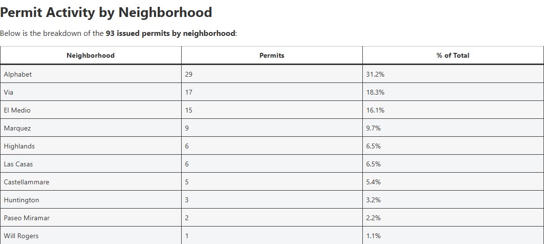 • The top three areas (Alphabet, Via, and El Medio) represent approximately 65% of all permits, reinforcing that activity remains concentrated in core rebuild zones.