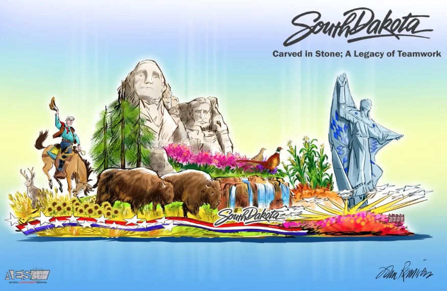 This float, which is 53 in the lineup is called “Carved in Stone: A Legacy of Teamwork.” It includes the rugged formations of Badlands National Park, roaming bison across the prairie, and, of course Mount Rushmore. This is only the second time in the parade’s history the nation’s 40th state has had a float.