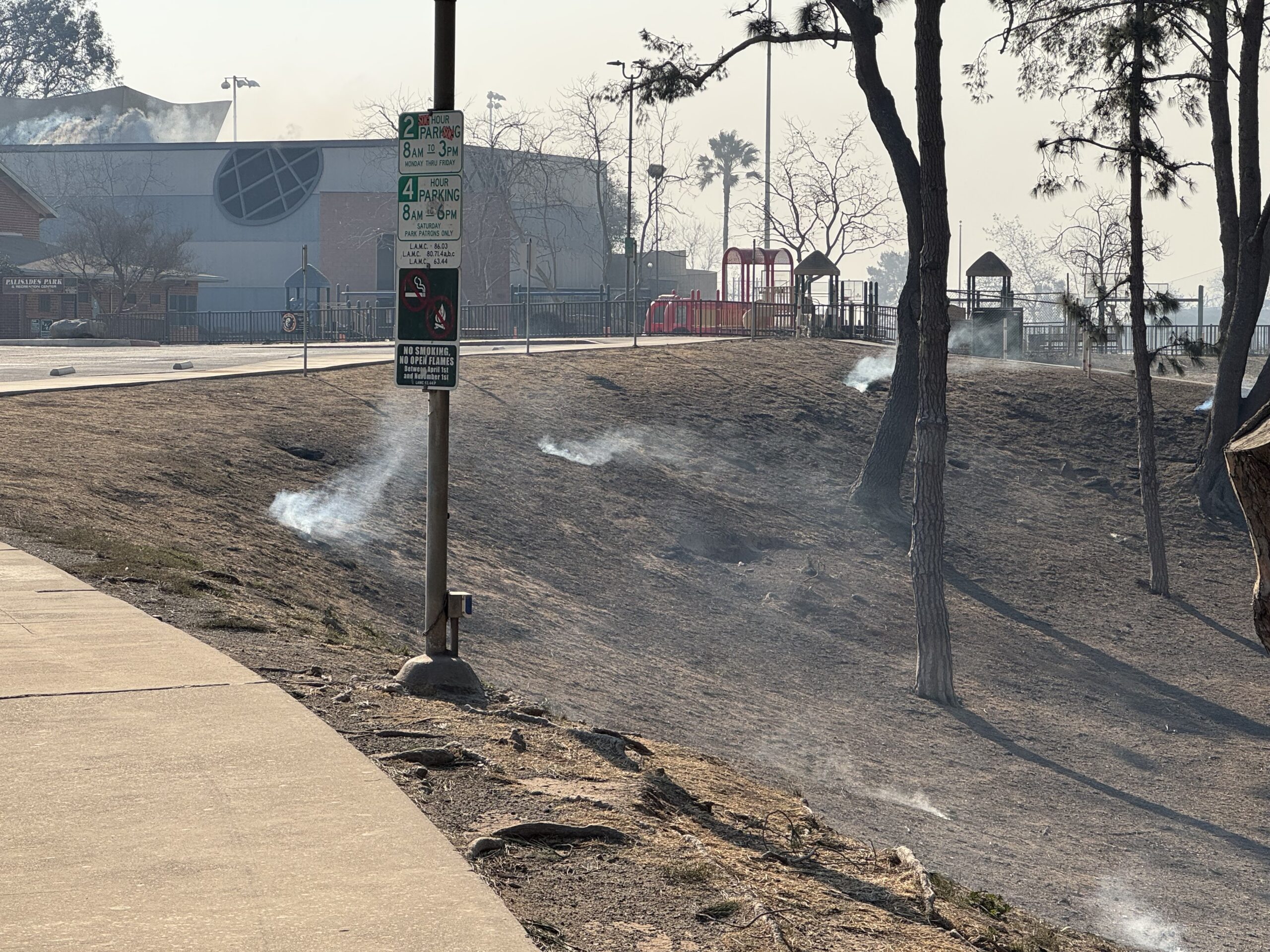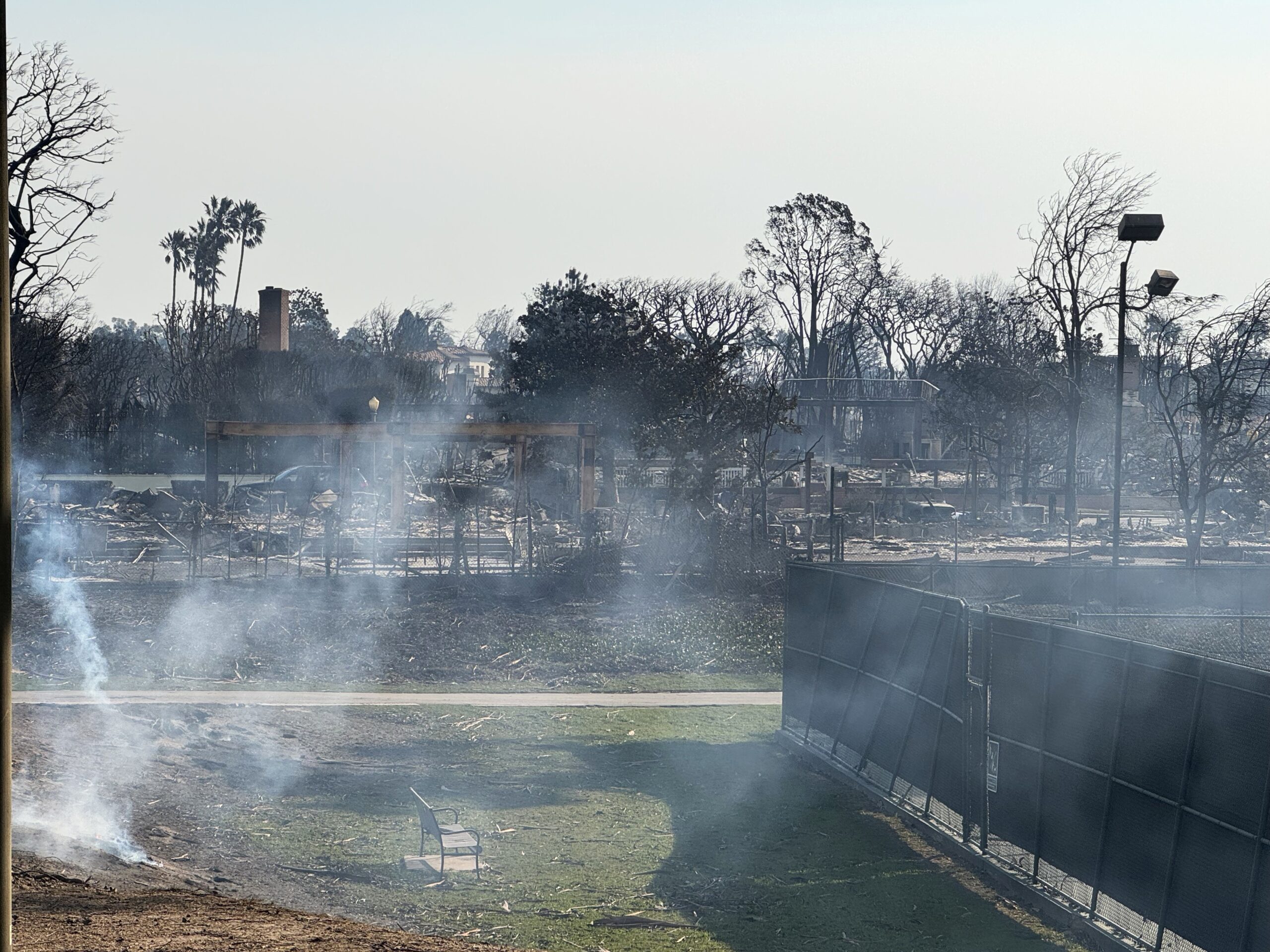 On Thursday, January 9, there were embers smoking around the Palisades Rec Center and the tennis courts. The homes around that area were destroyed by fire.