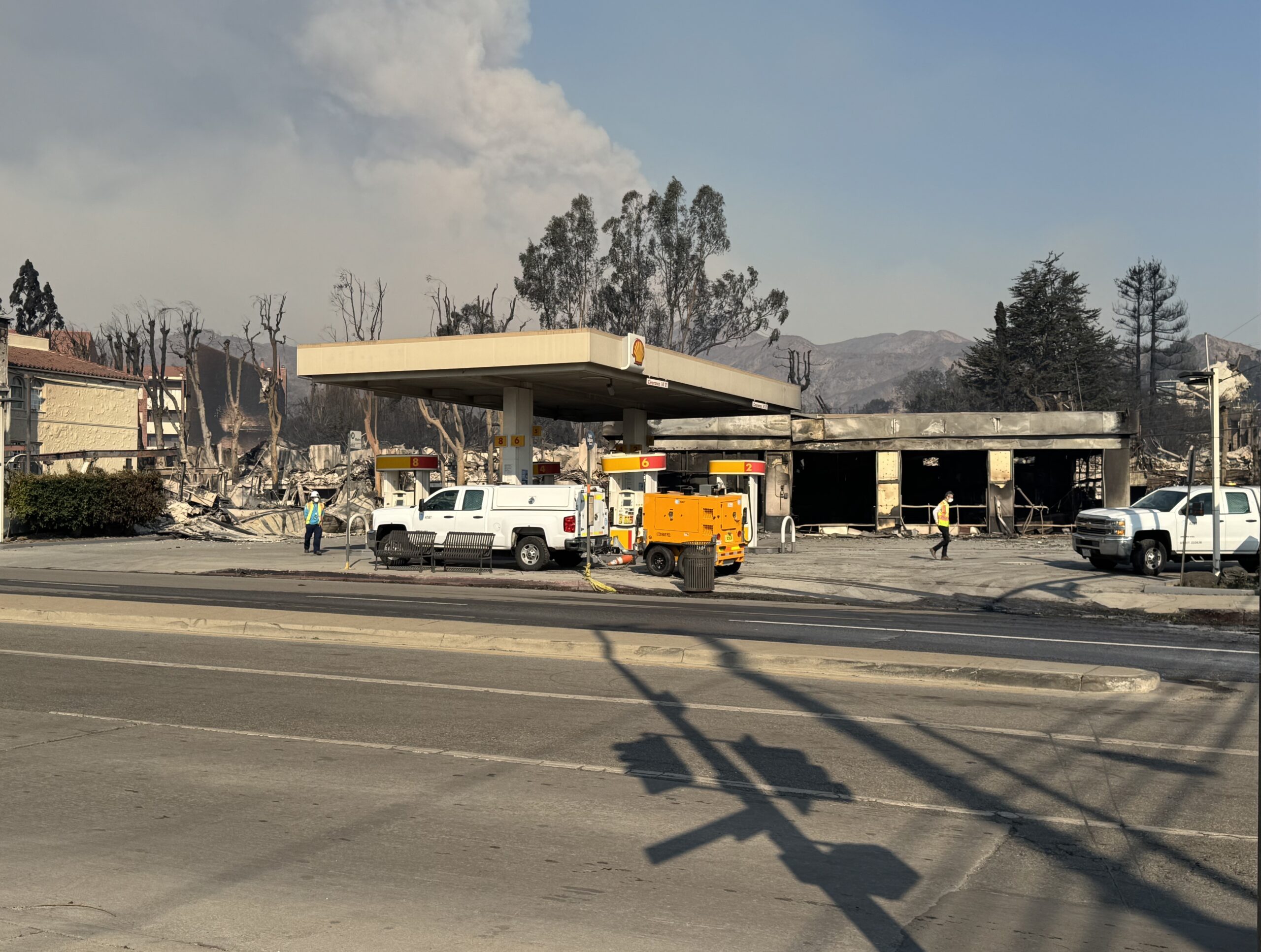 The large condo building (3-4?) stories high that was behind the Shell station is gone. The Shell station, which was the last place in Pacific Palisades to have cars repaired suffered severe damage.