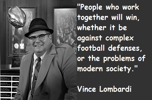 We need a team of all groups working together. As football coach Vince Lombardi said, “People who work together will win,” whether it be against complex football defenses, or the problems of modern society.