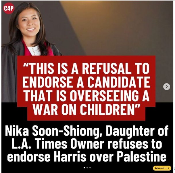 During a particularly brutal ratio, Nika was repeatedly condemned as a “nepo baby,” shamelessly invoking the suffering in Gaza to justify her father’s pandering to Trump. Actress and playwright Maya Contreras received 2,300 likes and over 570 retweets for the following response: “Bullshit. Your dad is a billionaire who blocked the @latimes from endorsing Kamala Harris to appease Trump and his BFFs Elon Musk.