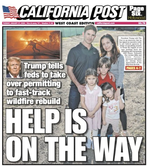 The California Post ran a January 27 story “Trump signs executive order for feds to take over LA’s ‘nightmare’ wildfire rebuild in huge boost for victims.” In that story they note that less than 15% of all homes destroyed by the fires have received necessary approvals to move forward, according to the Trump administration.”