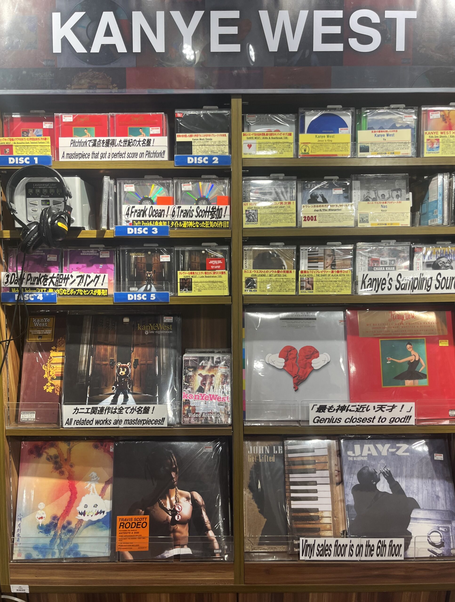 Japan loves foreign releases, too. Two floors are dedicated to them, including a shrine for… Kanye West. A sign above the display reads “Genius Closest To God!” Some things never change, I suppose.
