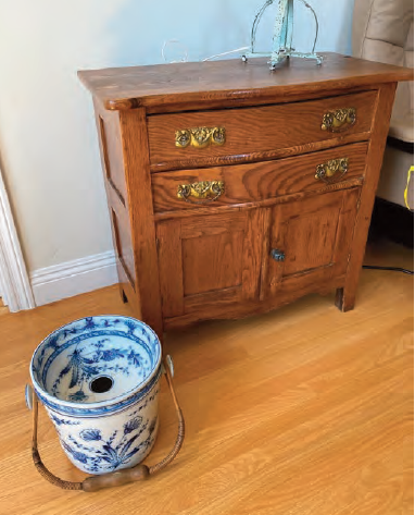 Before indoor plumbing, a pitcher of warm water was placed on the top of the cabinet adjacent to a basin for washing at night. The drawers would hold wash cloths and towels.