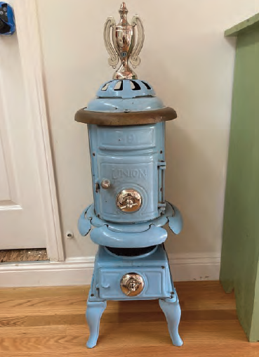 This is a cast iron enameled wood burning parlor stove. It was used to warm the Parlor which was the room where families and friends spent their evenings together.