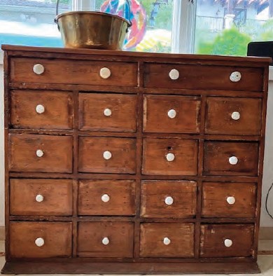 This is an old apothecary cabinet that I bought in the mid 60’s. I believe it was imported from England. It was an antique then, so I assume it was made in the 1800’s.