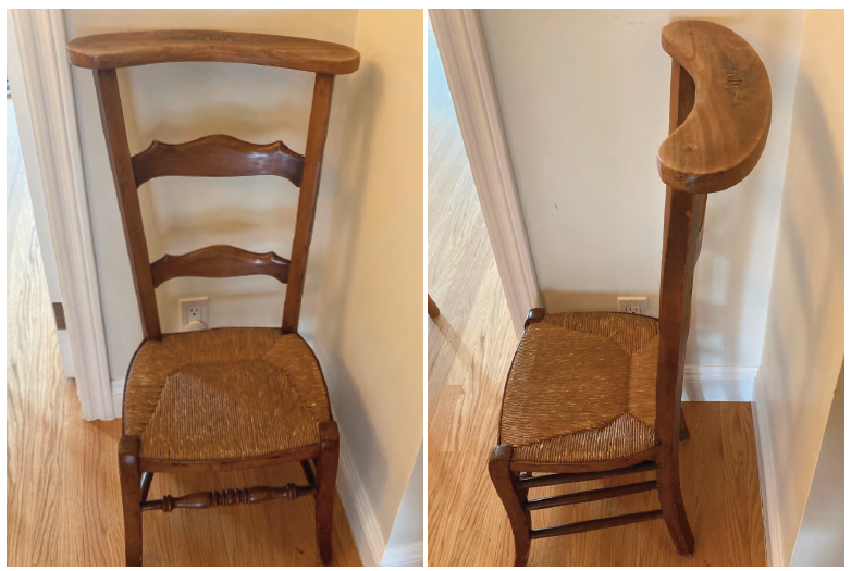 I think the chairs are from around 1900 and are a fairly simple design. The congregants would sit on them. When it was time to pray and kneel, the chairs would be rotated. The Bible would be placed on the broad top of the back. You can see how low the seat is which is about the right level for kneeling.
