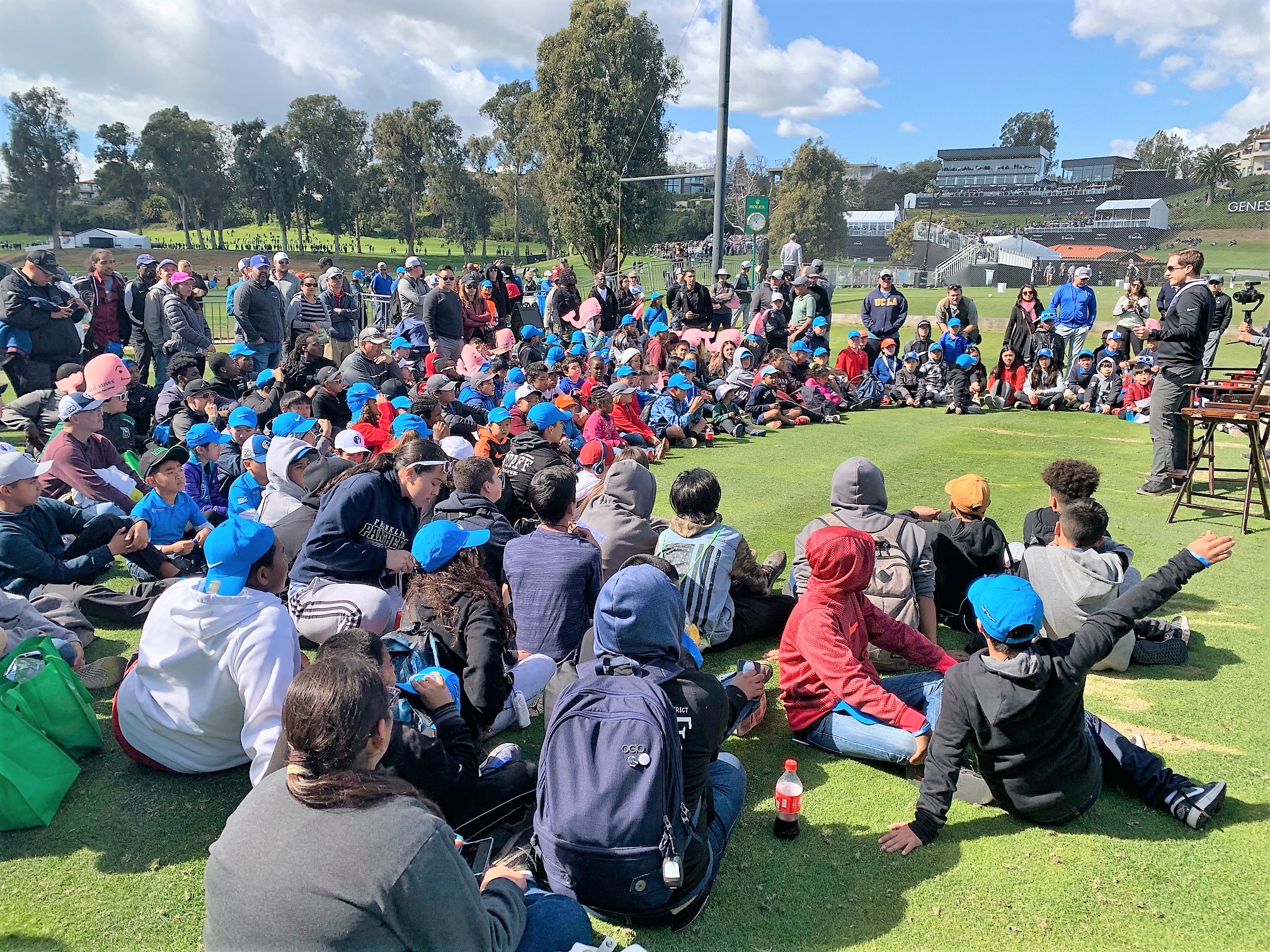 Kids gathered on the practice chipping range at the Riviera Golf Course to listen to golf pro Peter Malnati.