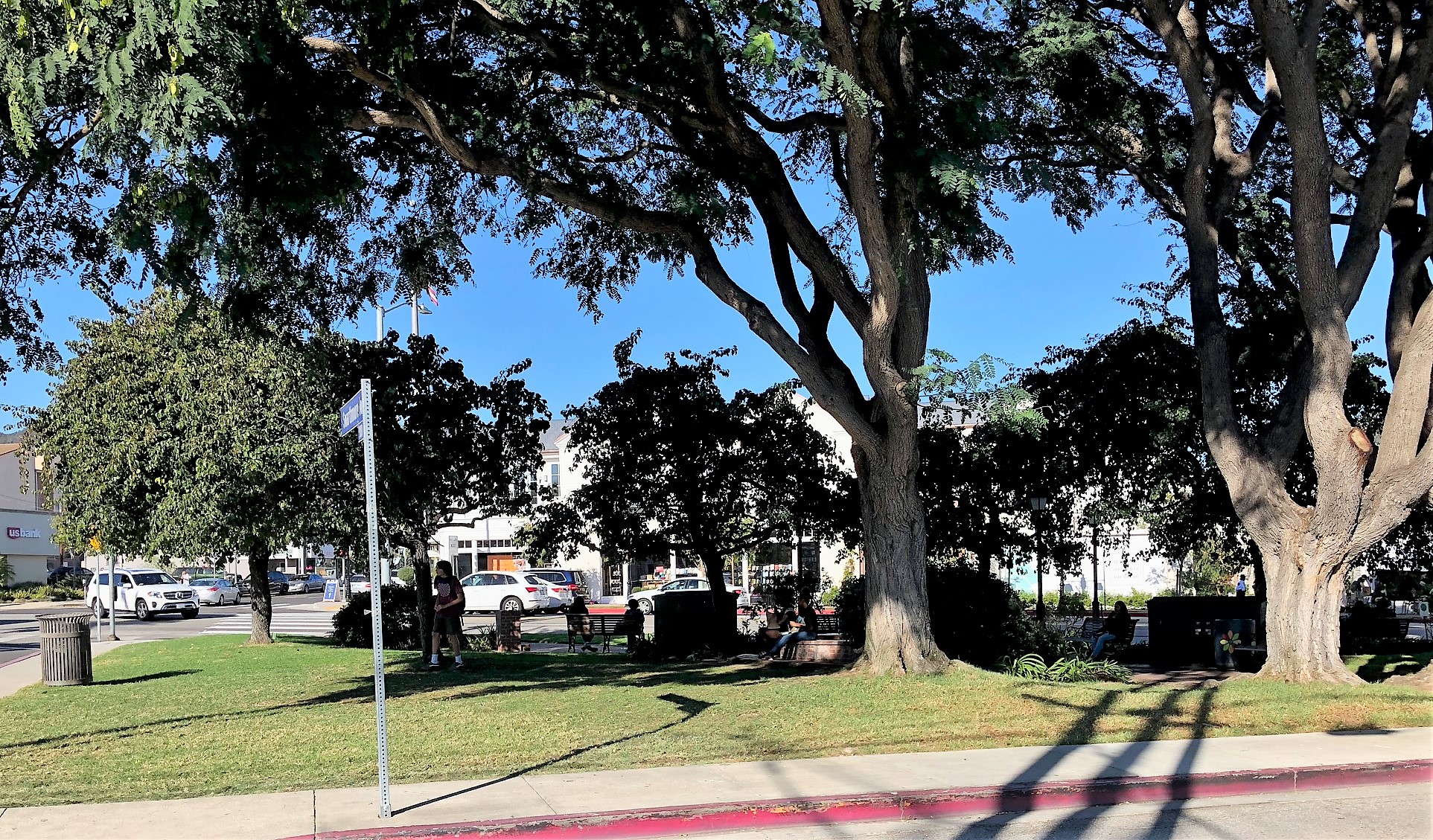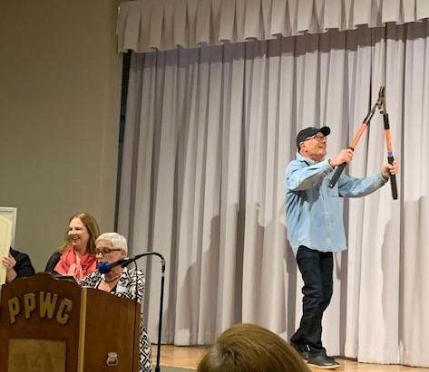 The Village Green is a private park, maintained and sustained by a nonprofit. As Marge explained that the Woman’s Club grant would be used to trim the ficus trees, Bob wandered about on the stage with a gigantic pair of clippers.