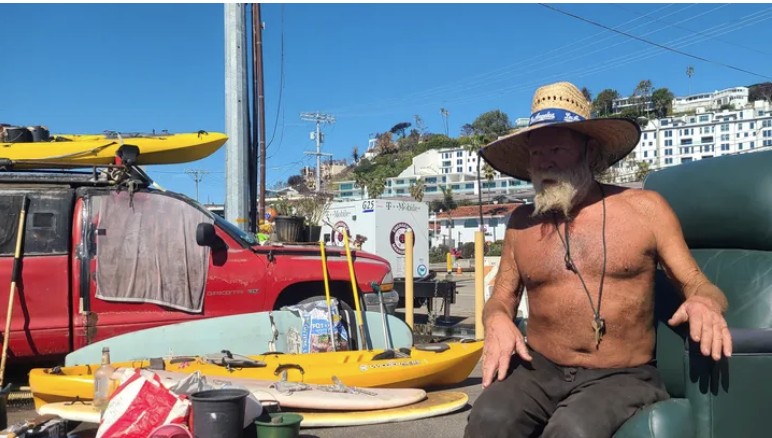 Randy Wright, who has been living at the edge of the Gladstone’s Parking lot, at PCH and Sunset Drive, was featured in Shacked eight months ago. (PHOTO: The Los Angeles Surf MAG)