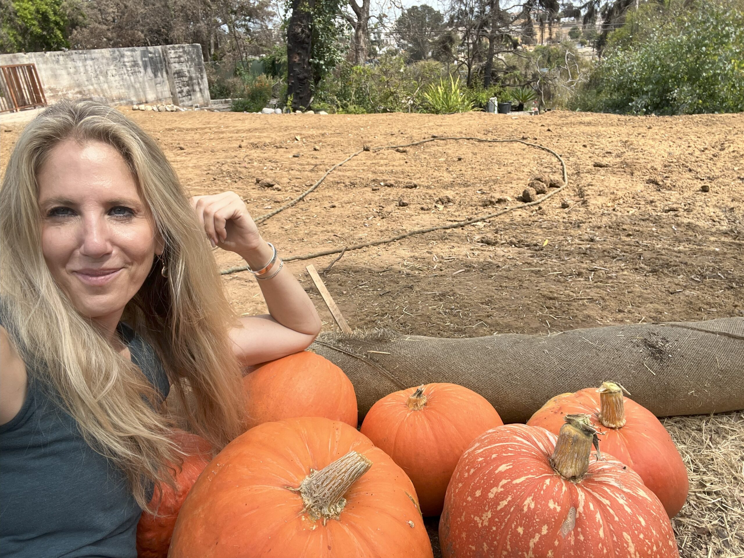 “Farmer” Jessica Rogers with her pumpkin crop that she grew this year in her lot.
